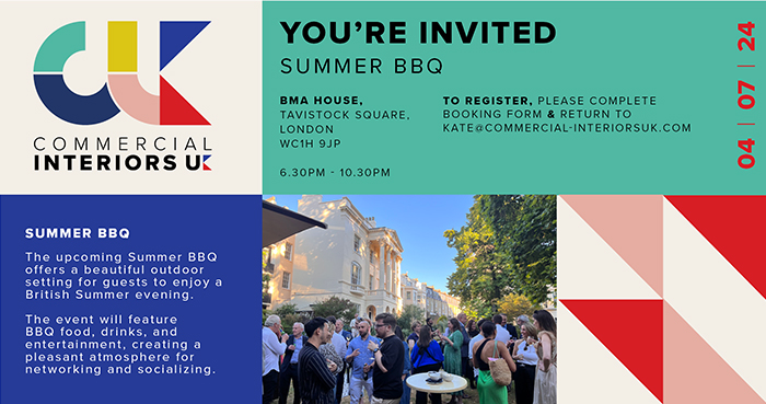 To book click here, complete the booking form and send to kate@commercial-interiorsuk.com